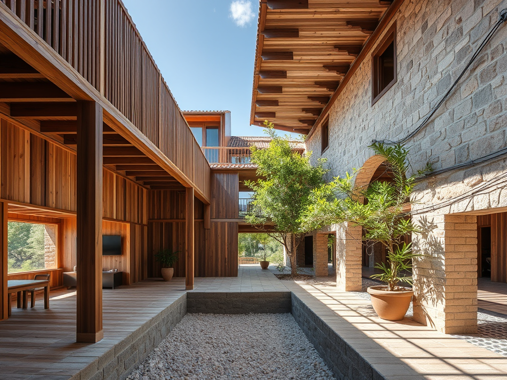 - استخدام الحجر المكشوف والخشب المعالج لضمان استمرارية الهيكل وصلابة الواجهات.